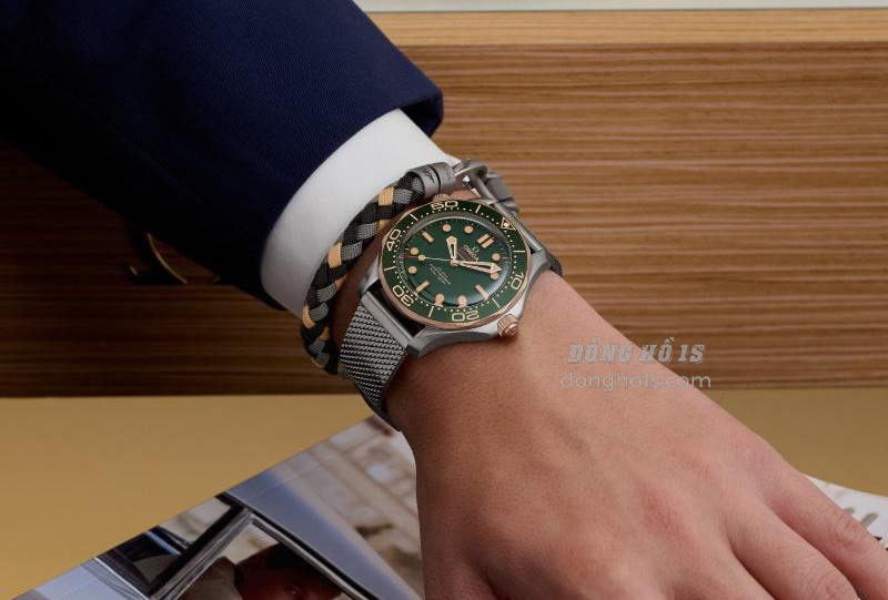 Điểm nhấn ấn tượng nhất chính là yếu tố màu xanh lá độc đáo. Vòng bezel xanh làm từ nhôm oxy hóa anodized axit oxalic, kỹ thuật đặc biệt giúp màu xanh trở nên rực rỡ và đa tầng, khác biệt so với bezel đồng hồ lặn truyền thống. Bezels được kết hợp với vạch chia độ lặn phủ lớp dạ quang Super-LumiNova phong cách cổ điển, giúp hiển thị rõ ràng trong điều kiện thiếu sáng, không chỉ hỗ trợ thợ lặn đọc giờ chính xác mà còn tăng thêm nét quyến rũ bí ẩn cho đồng hồ. Vật liệu bezel màu thường Rado luôn tự coi mình là ông vua, thì trên chiếc Omega này có lẽ chính Rado cũng sẽ cảm thấy rất vui vì hãng đã ứng dụng màu trên vật liệu nhôm rất đẹp.